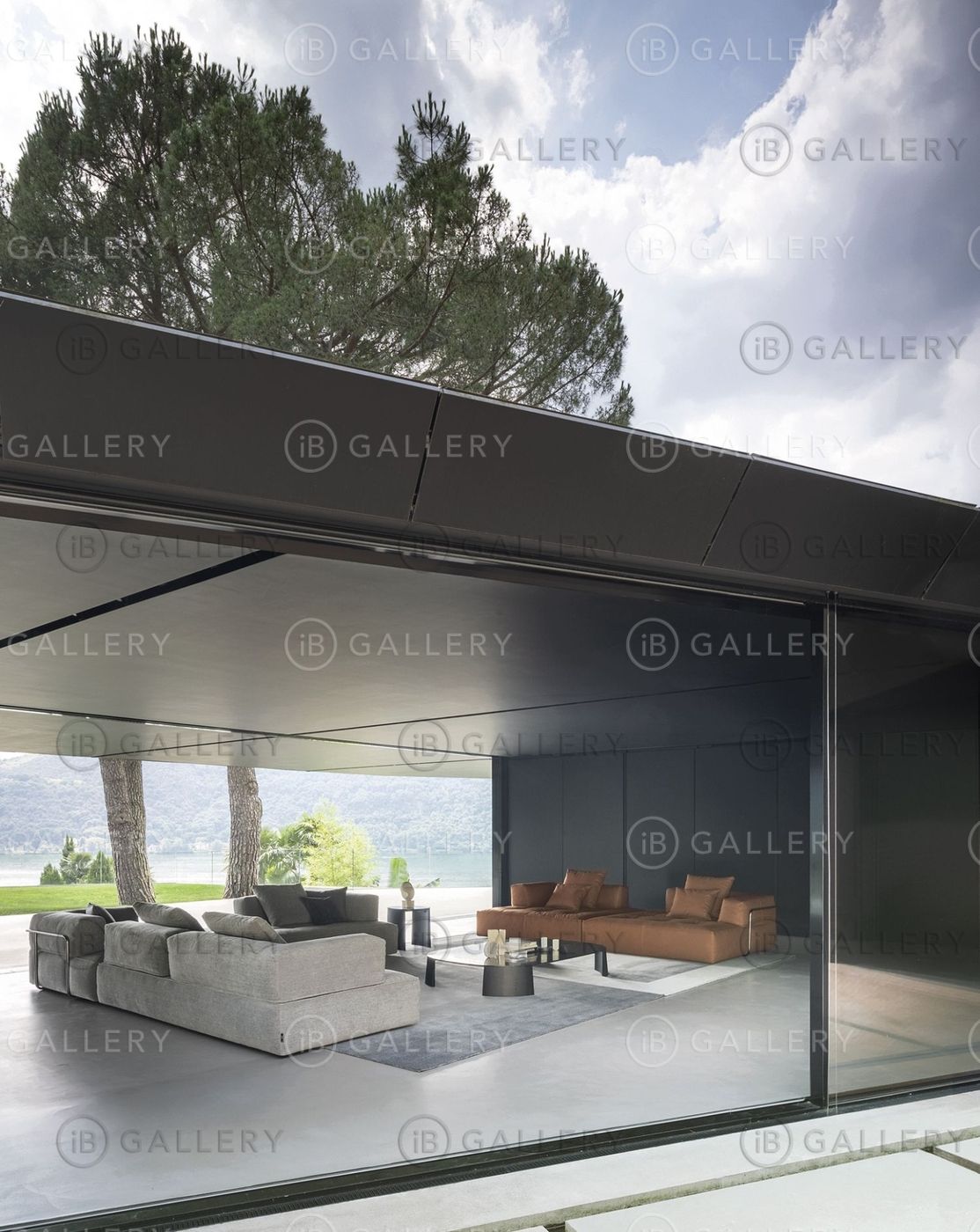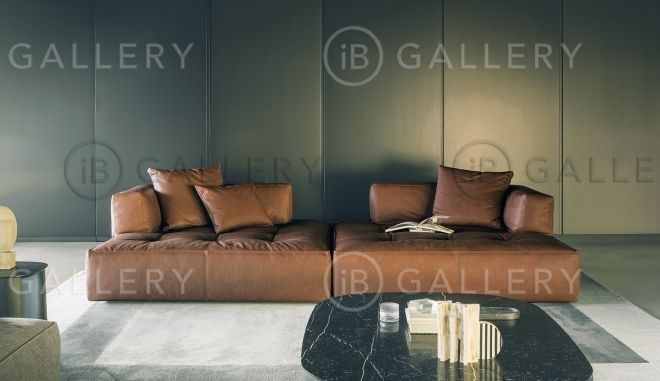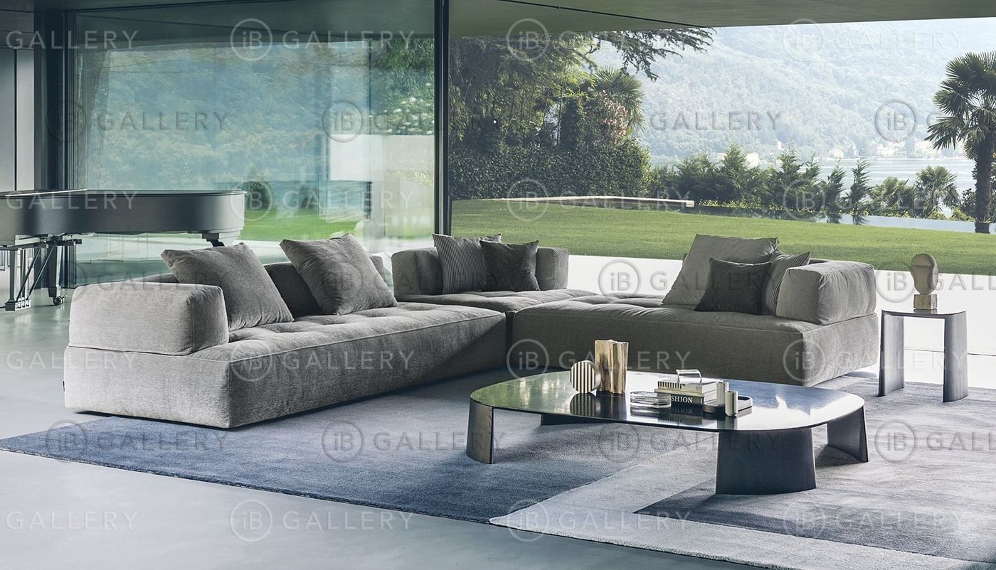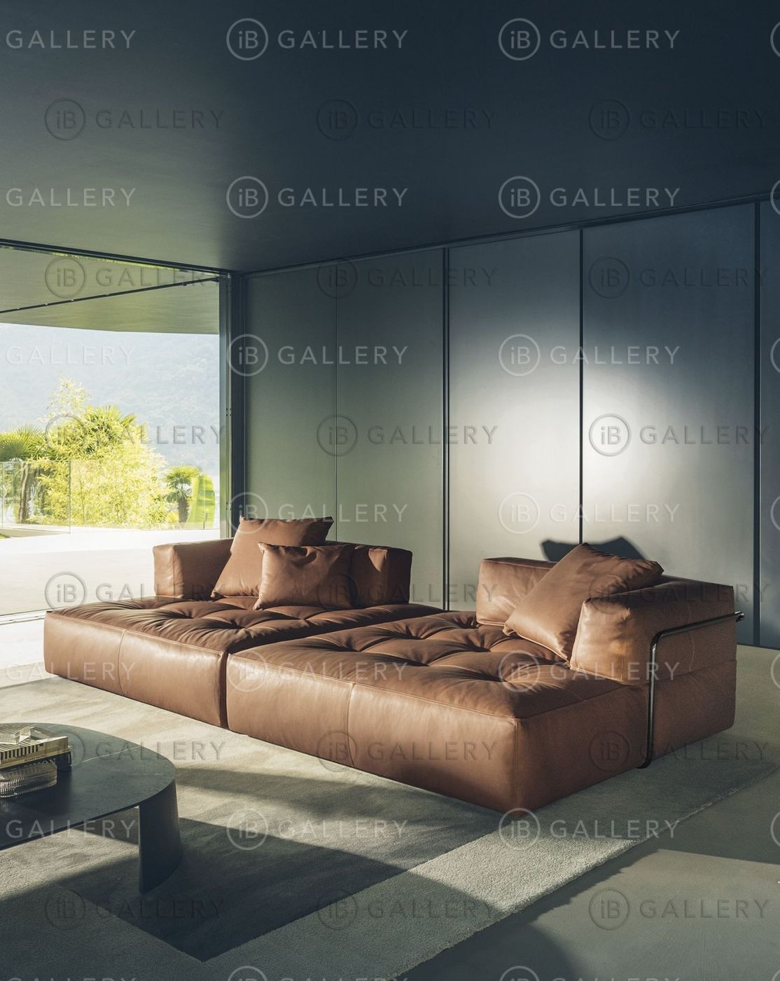 Обивка сиденья с эффектом “капитоне” на глубоких пуговицах и декоративной строчкой, подчеркивающей его контуры. Коллекция состоит из подвижных спинок различной формы, прямых или наклонных, которые могут стоять отдельно или сочетаться с угловой конструкцией из черного хромированного металла.