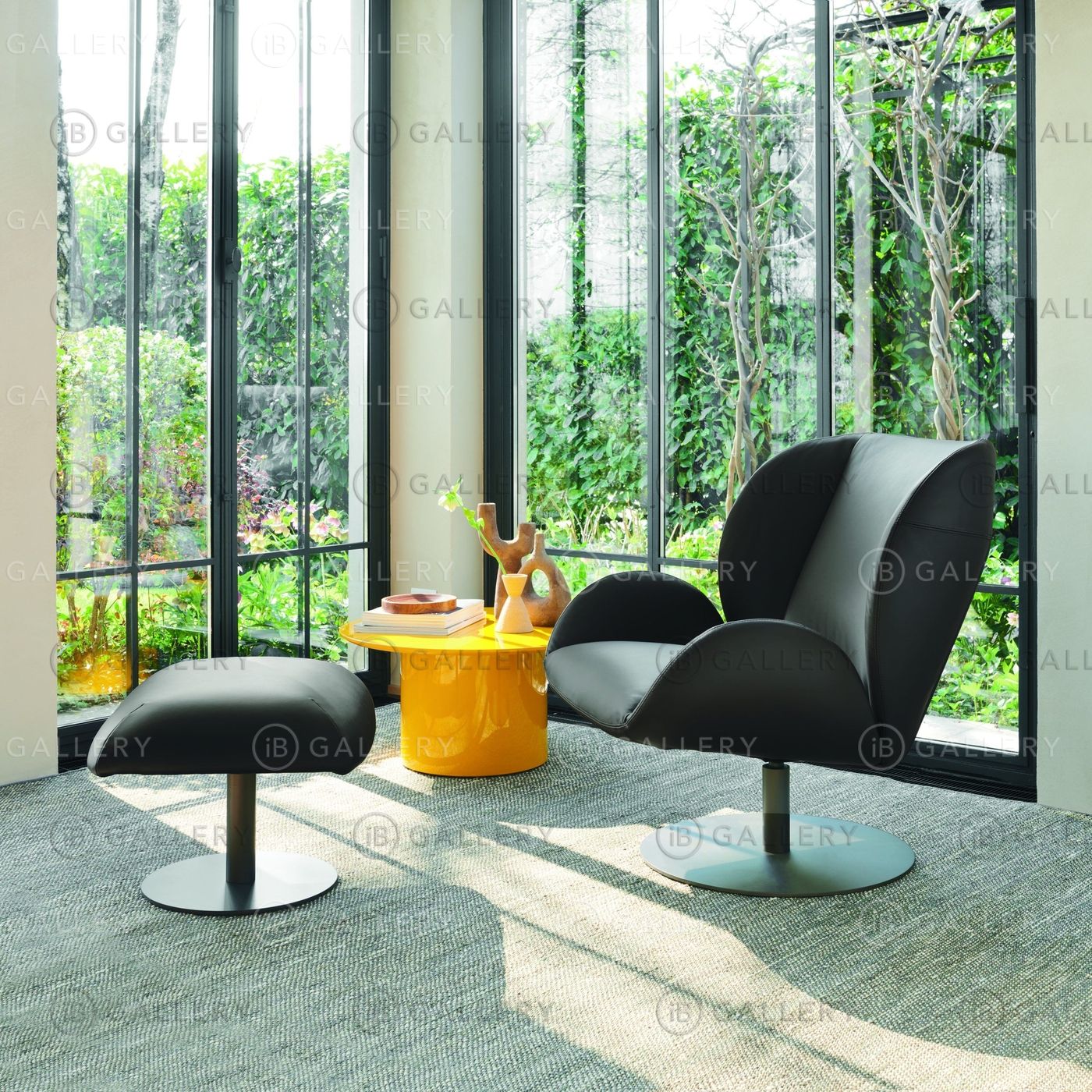 Пуф опирается на центральное вращающееся стальное основание, окрашенное в темно-бронзовый цвет или в цвет RAL по запросу. Обивка доступна в ткани или кожи.