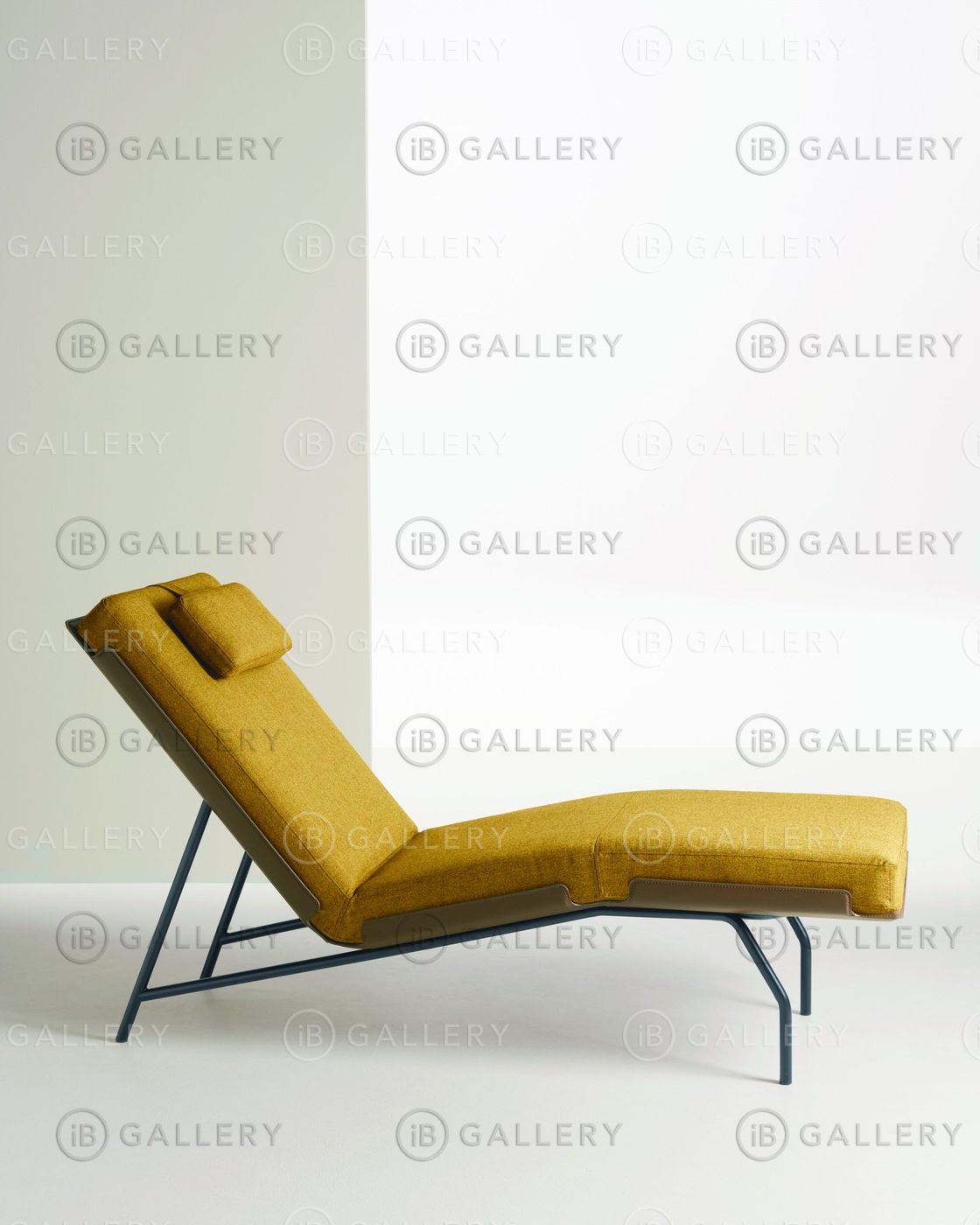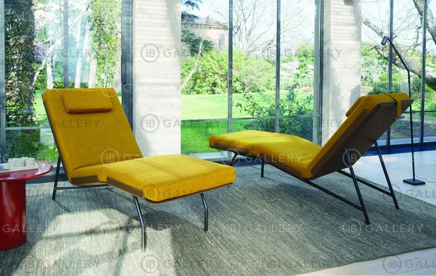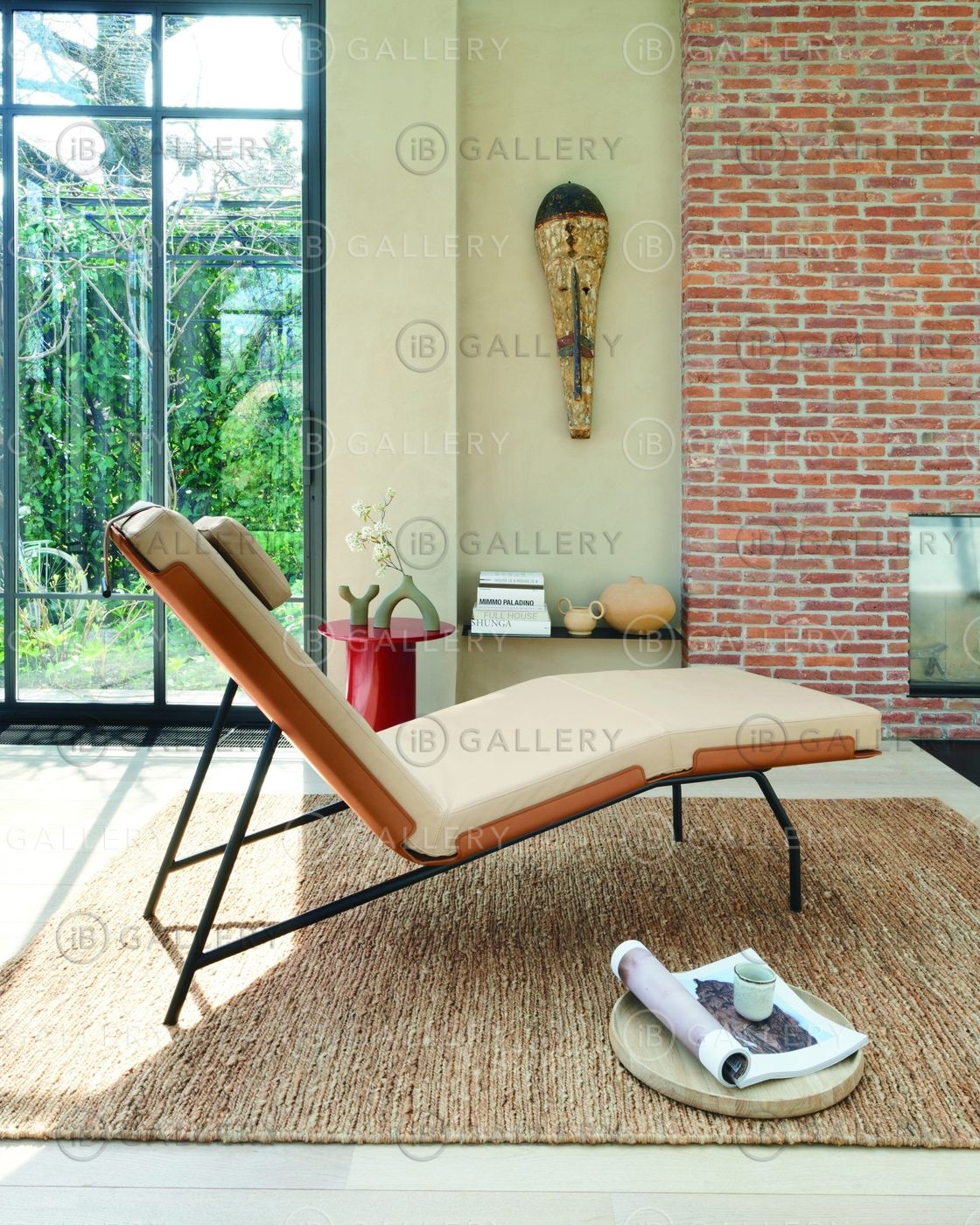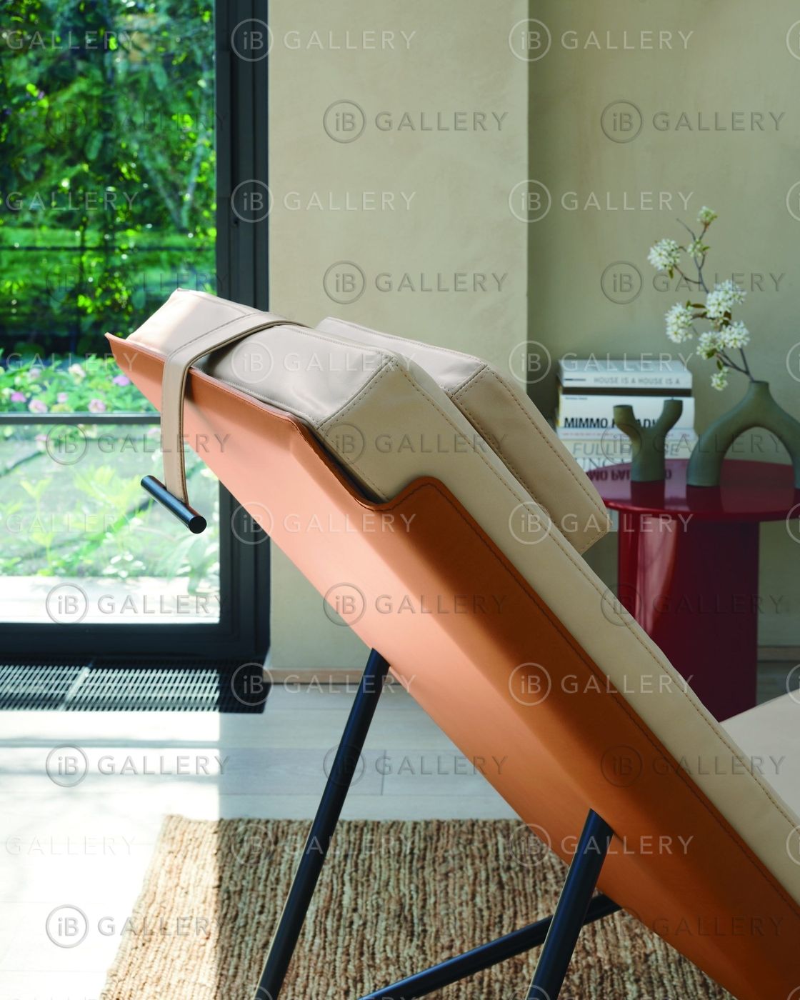 Шезлонг Caruso демонстрирует сдержанную элегантность, в котором идеально сочетаются комфорт и геометрическая чистота. Его дизайн представляет собой диалог между тонким жестким корпусом, обтянутым кожей, который складывается, образуя подушку и подголовник, и характерной трубчатой стальной рамой, асимметричной и минималистичной.
