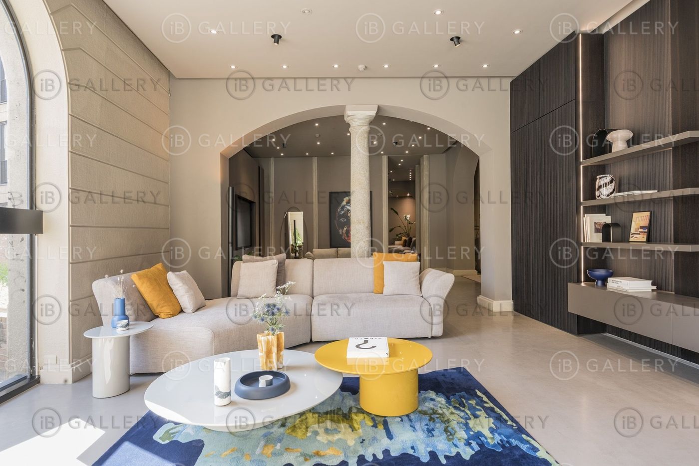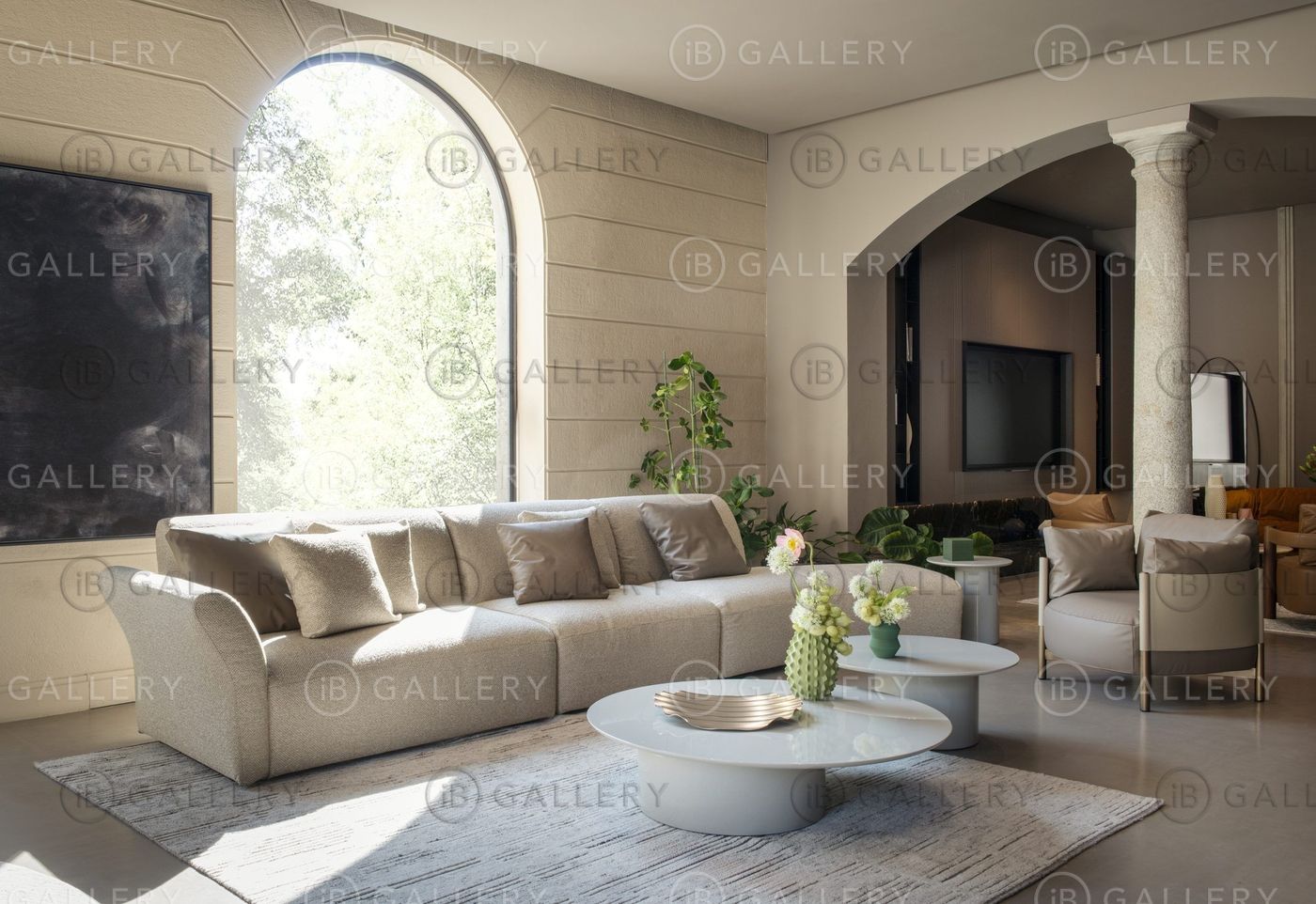 Модульный диван, состоящий из линейных элементов и более сложных геометрических форм, подходит для различных композиций и условий.