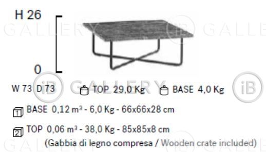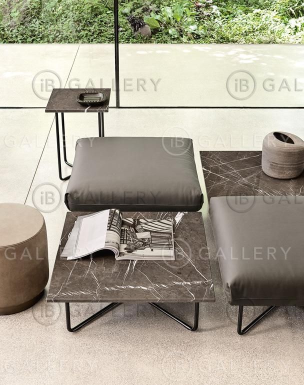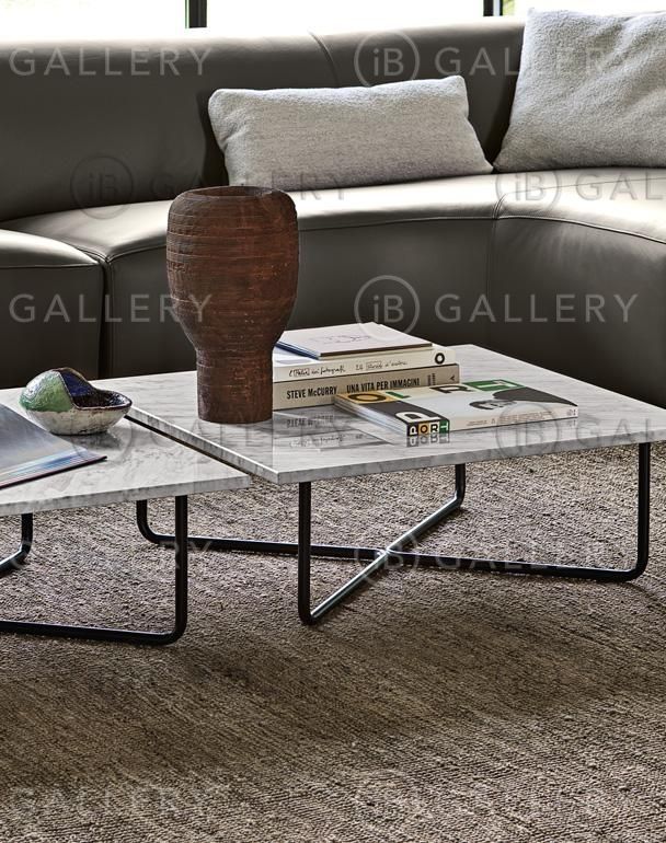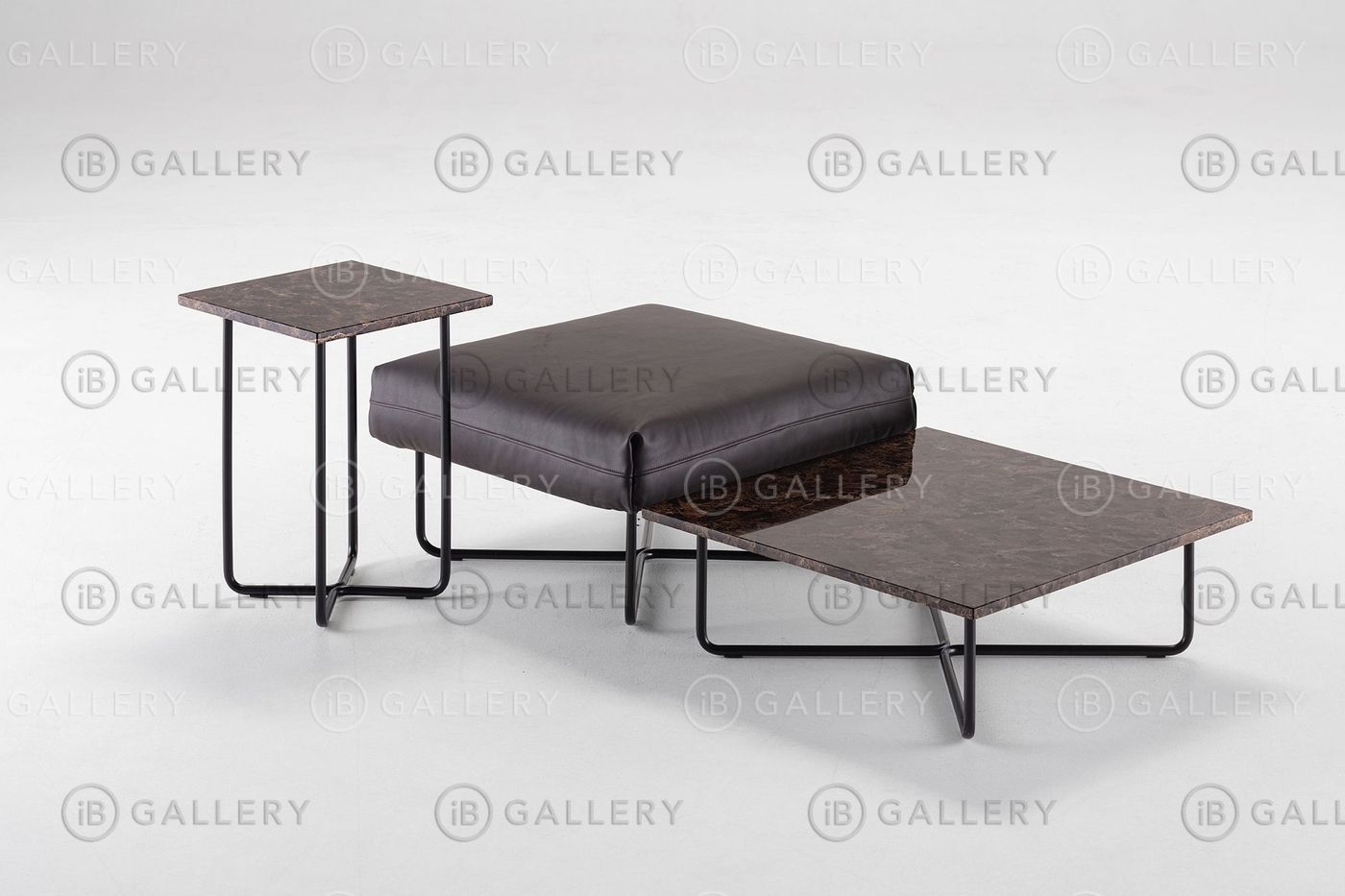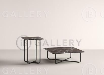 Низкий вариант, высотой 26 см, выполнен в виде центрального элемента интерьера и имеет квадратную столешницу из мрамора. Изящная металлическая конструкция ножек придает столу почти воздушную легкость.
