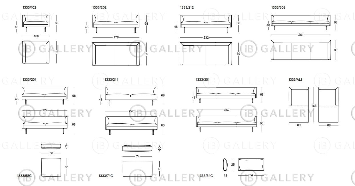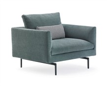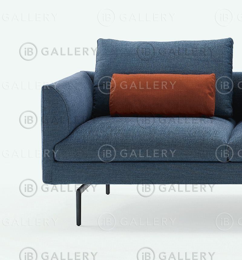 Линейность дивана подчеркивается характерным дугообразным швом на передней части подлокотника, ножки из алюминиевого сплава слегка вдавлены по бокам, что создает ощущение легкости, мягкие части имеют удобные посадочные места, в то время как подлокотники спинка и подлокотники выполнены из цельного куска одинаковой высоты, разделенного подушками разных размеров.