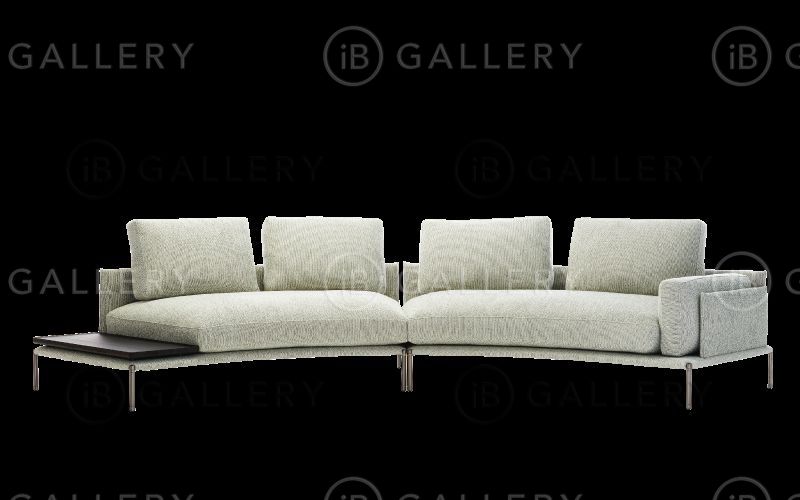 Ножки из стали с матовым покрытием из черного никелированного сатина или графитового лака. Стальная рама. Подвеска из эластичных лент. Цельная подушка сиденья из полиуретана/регенерированного полиэстера. Подушка для спинки из 100% новых гусиных перьев. Подушка для подлокотника из регенерированного полиэстера. Прямые и изогнутые торцевые части дивана могут быть оснащены подушкой для подлокотника или подносом из массива ясеня, окрашенного в черный матовый цвет, с открытыми порами, который устанавливается на опорное основание дивана. Съемный чехол из ткани или кожи.