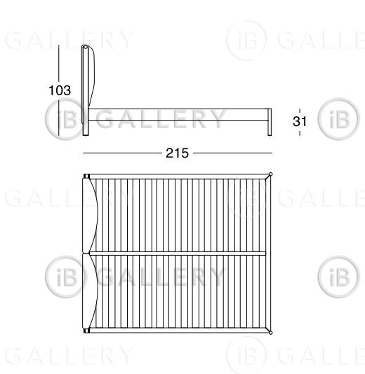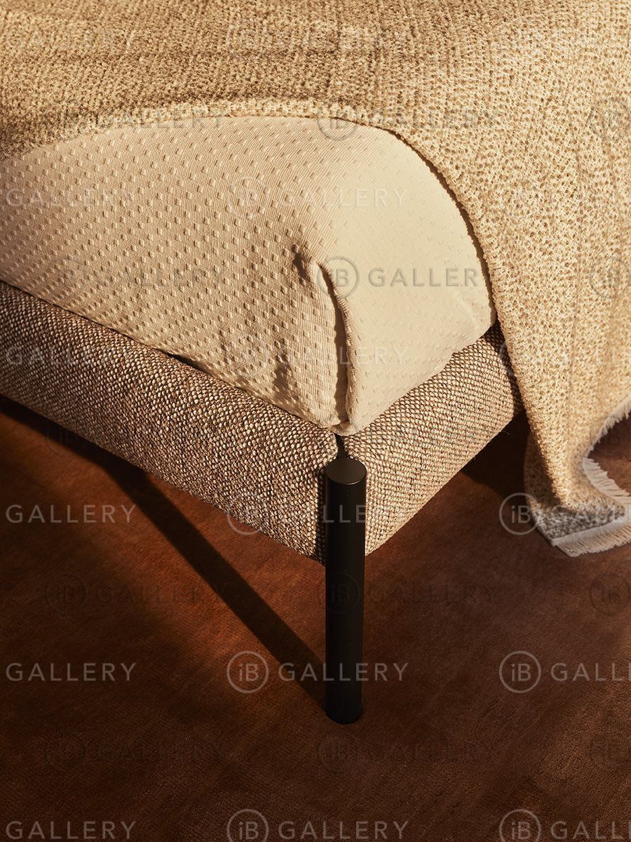Кровать с одним или несколькими пружинными блоками. Каркас изголовья из натурального или окрашенного в черный цвет дуба с открытыми порами. Обивка из полиуретана/термоусаживаемого полиэфирного волокна. Передние ножки и верхняя планка изголовья кровати выполнены из матово-черной лакированной стали. Съемный чехол из ткани или кожи. Стальное основание с натуральными гнутыми буковыми планками шириной 6,8 см.