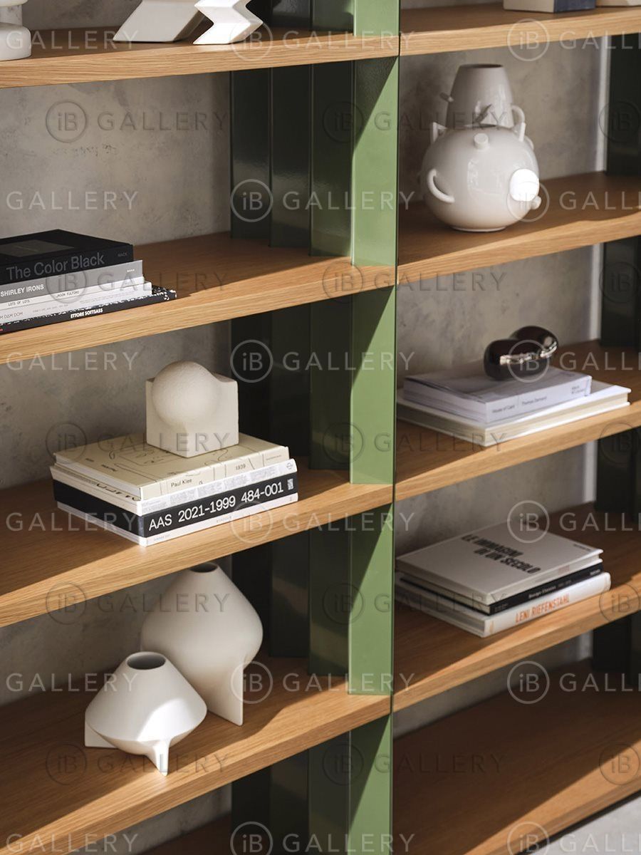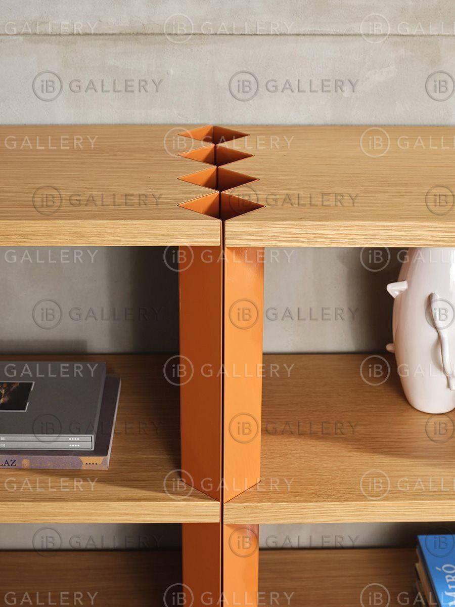 Каркас выполнен из полированной окрашенной стали, цвета талька, карамели, апельсина, амаранта, водорослей. Полки из МДФ, облицованные натуральным лакированным дубом. Стеллажи, расположенные рядом, могут быть соединены с помощью предусмотренного соединения.