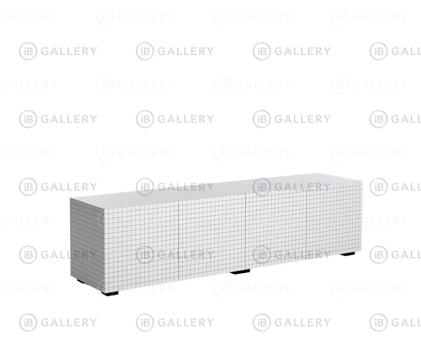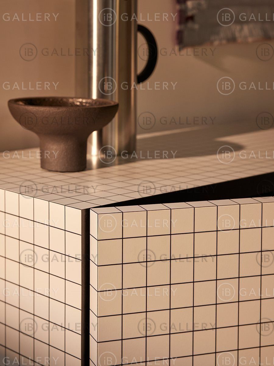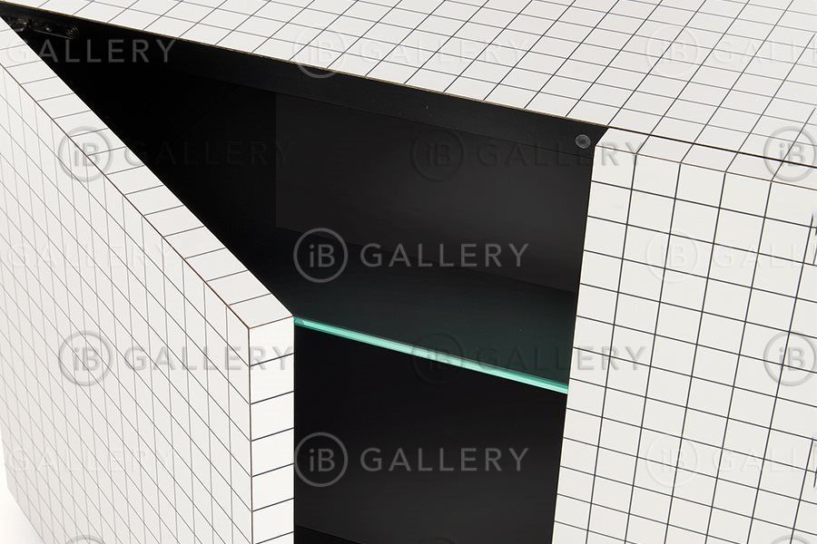 Поверхность покрыта белым ламинатом с нанесением цифровой печати в виде черных квадратов с интервалом 3 см. Внутренняя поверхность покрыта черным ламинатом.
