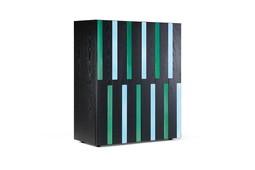 Рама из МДФ, облицованная ясенем с открытыми порами, покрытым лаком черного или амарантового цвета. Стеклянные вставки, окрашенные с обратной стороны в цвета мяты и неба для черного варианта или слоновой кости и коралла для амарантового варианта. Регулируемые внутренние полки из закаленного особо прозрачного стекла. По запросу в хранилище можно встроить нейтральный светодиодный источник света.