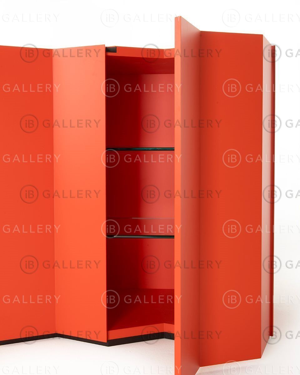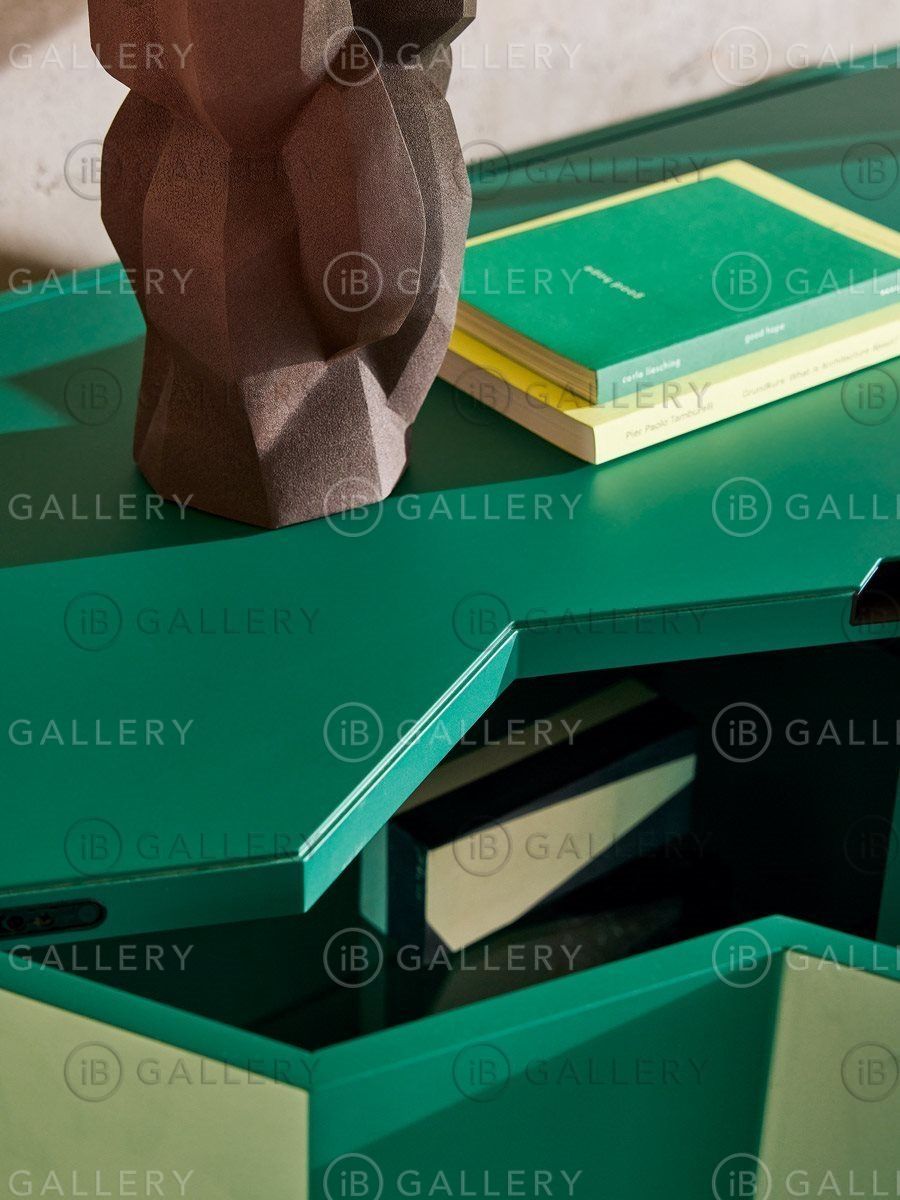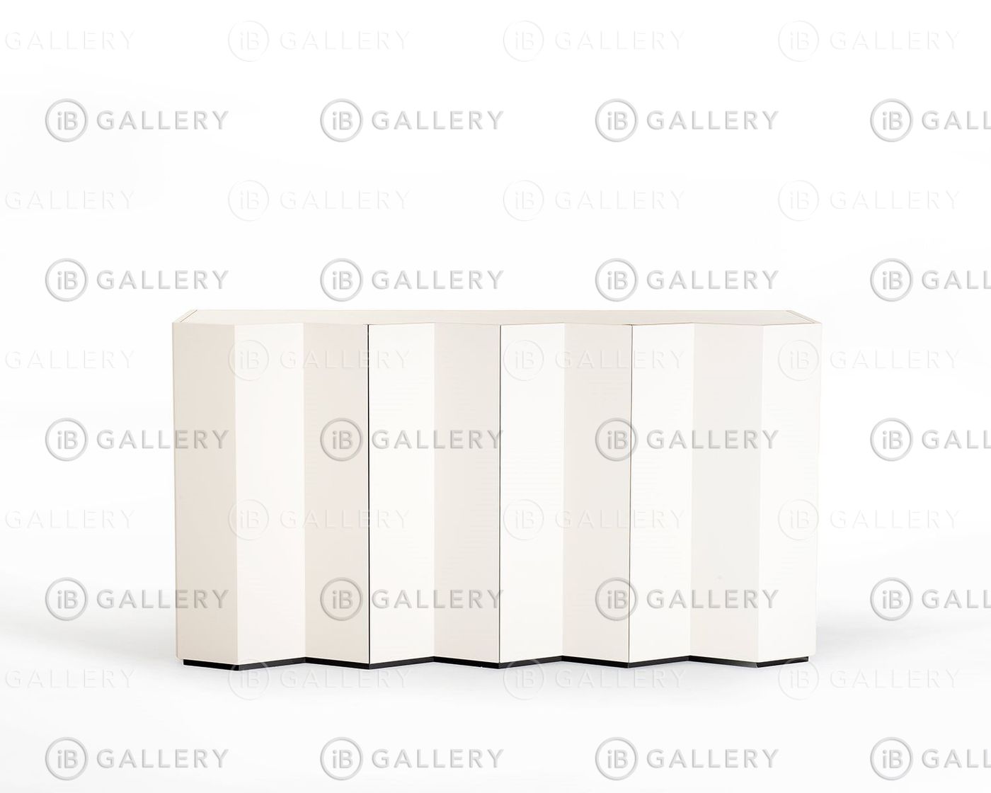 Каркас из МДФ и массива дерева, покрытый матовым лаком, доступно несколько расцветок. Регулируемые внутренние полки из закаленного зеркального стекла. По запросу в накопитель можно встроить нейтральный светодиодный источник света.