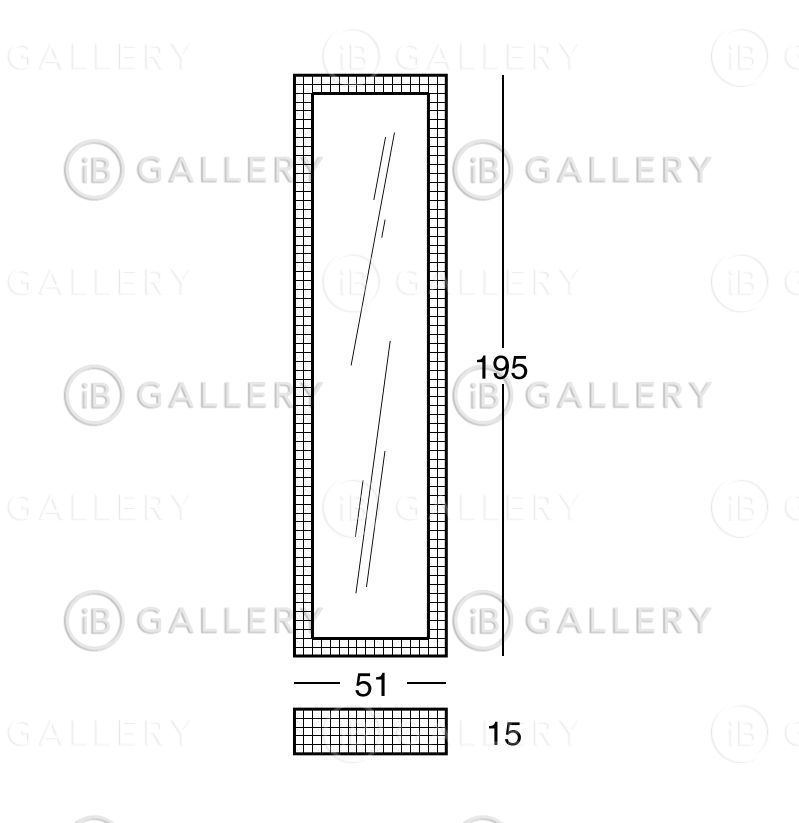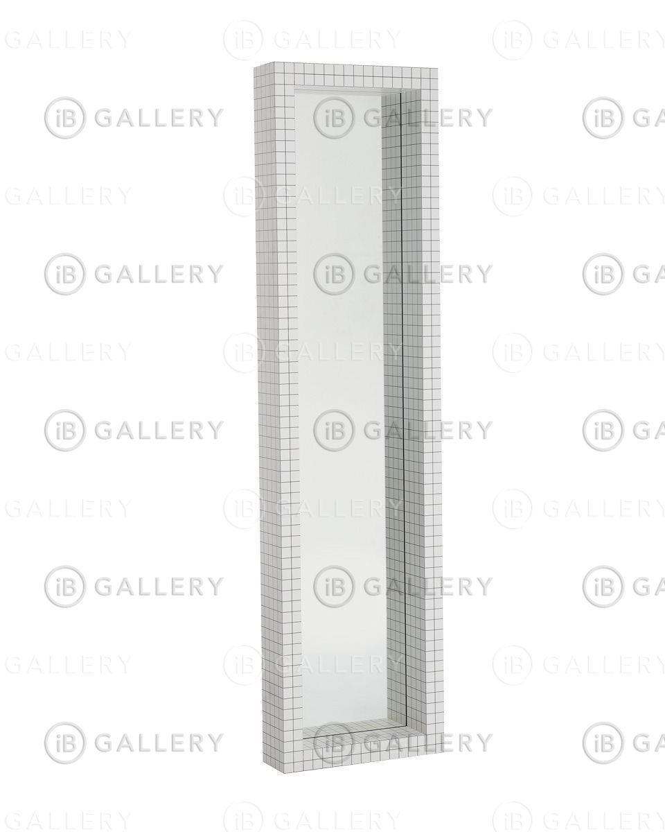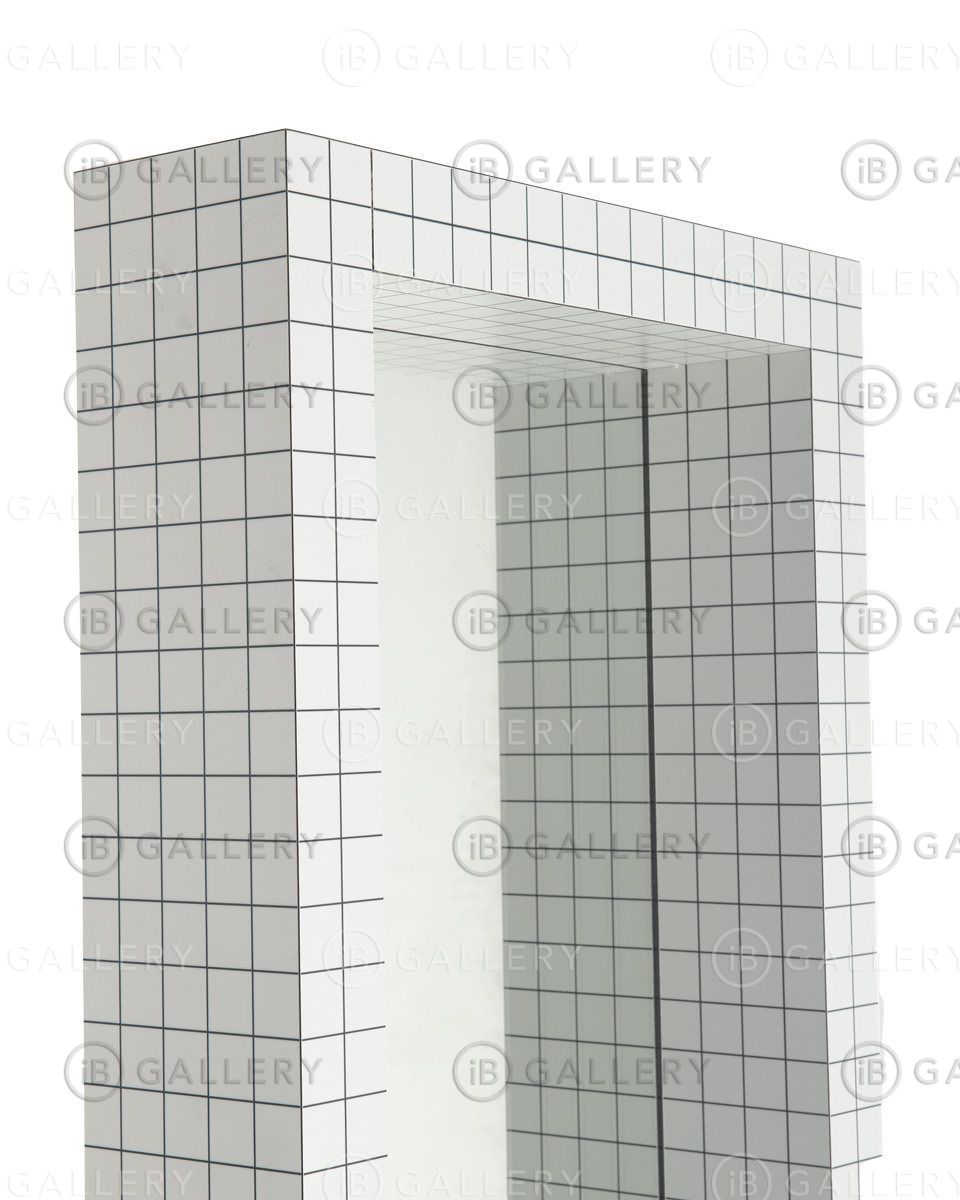 Зеркальное стекло толщиной 5 мм по периметру обрамлено рамой из ламинированного дерева с белой печатью, на которую нанесена цифровая печать в виде черных квадратов с интервалом 3 см.