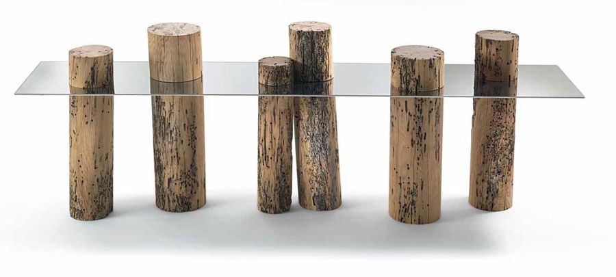 Необычное основание выполнено из нескольких толстых поленьев разной высоты.