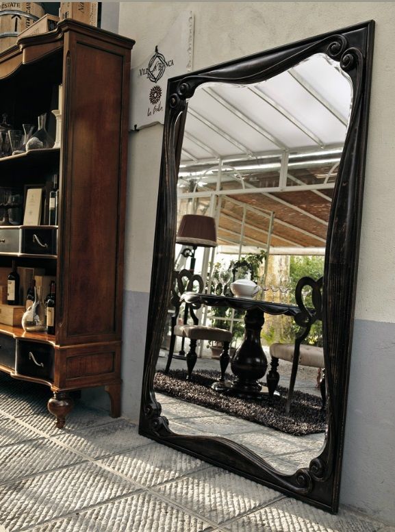 Напольное массивное зеркало прямоугольной формы с декорированной рамой.