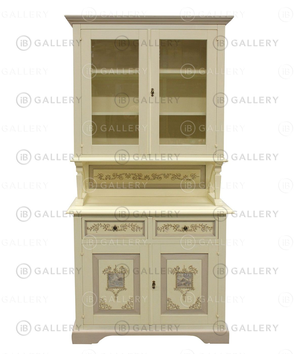 Верхние полки застекленные, нижние спрятаны за деревянными дверцами.