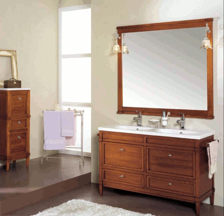 Композиция для ванной комнаты, выполненная в классическом стиле из дерева с прозрачной лакировкой.