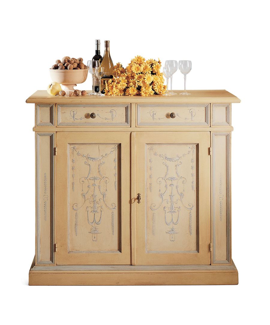 Двухдверный буфет выполнен из дерева в бежевом цвете.