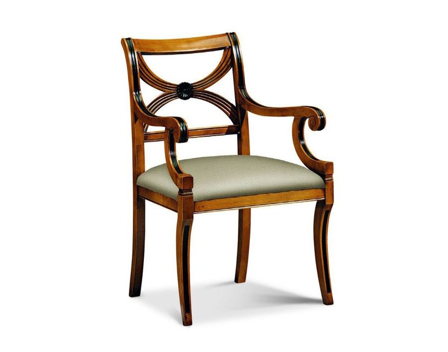 Обеденный стул с жесткими сквозными подлокотниками, изготовленный из массива дерева.