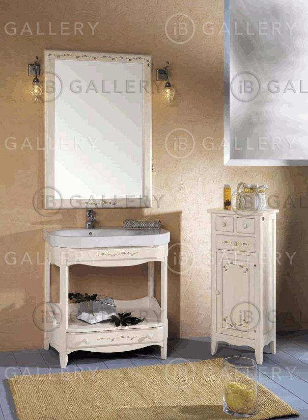 Тумба для раковины выполнена из дерева в белом цвете и украшена ручной росписью.