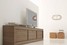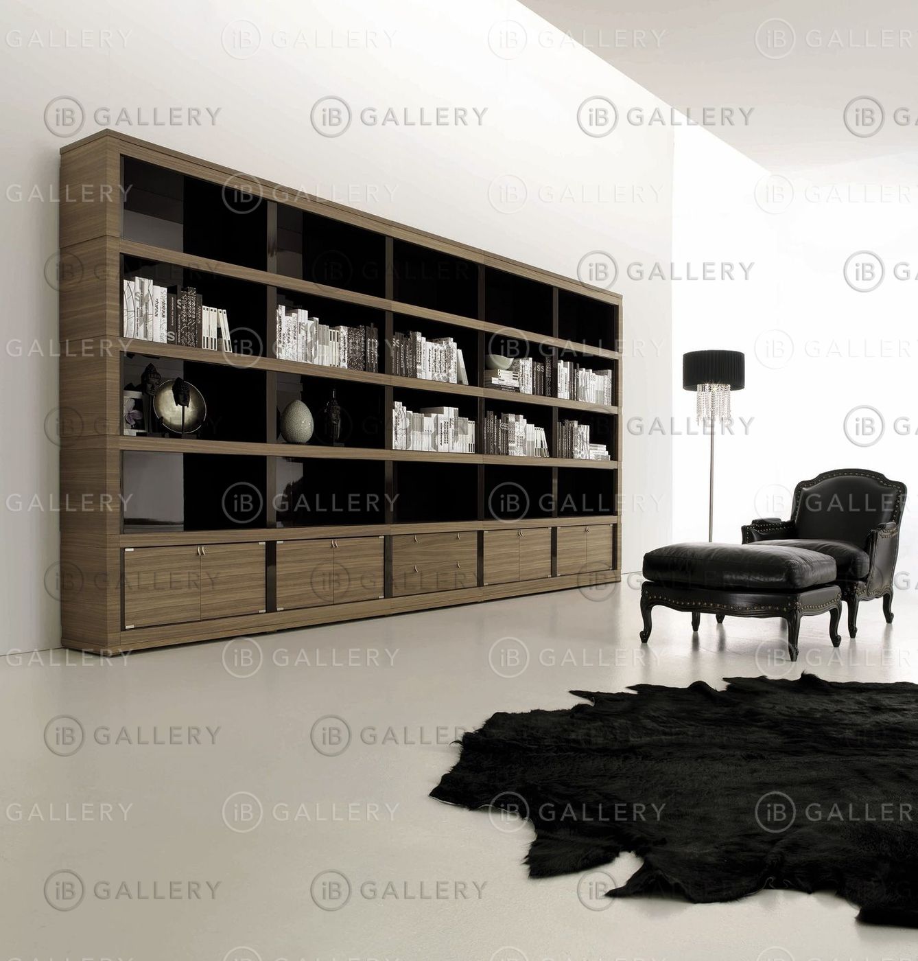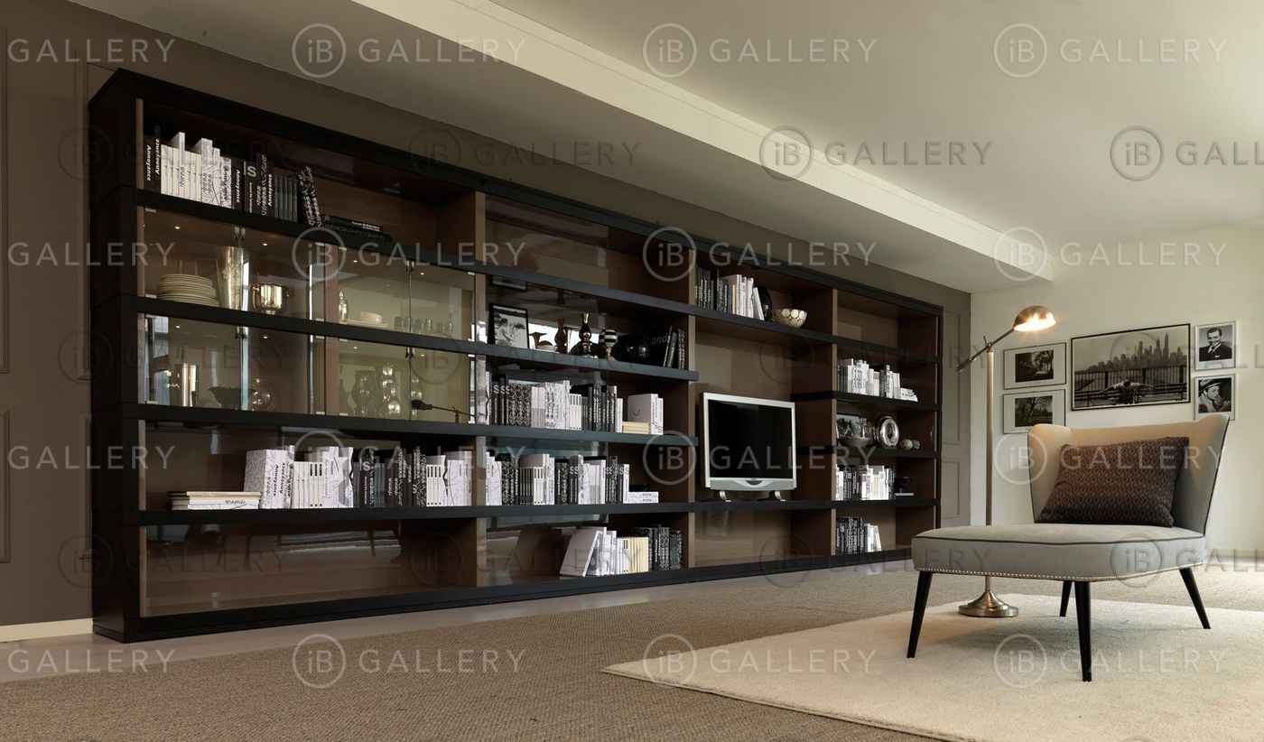 Модульная система состоит из открытых полок для книг, полок для ТВ и выдвижных ящиков.