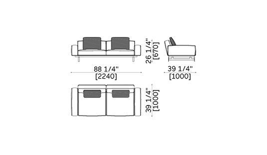 Конструкция, изготовленная из металла, покрытого тканью, представляет собой плоскую поверхность, опирающуюся на ножки, закрепленные шарнирами треугольного поперечного сечения. Это, в свою очередь, обеспечивает основу для подушек и подлокотников, которые просто опираются на конструкцию, не скрывая ее, тем самым подчеркивая контраст материала.