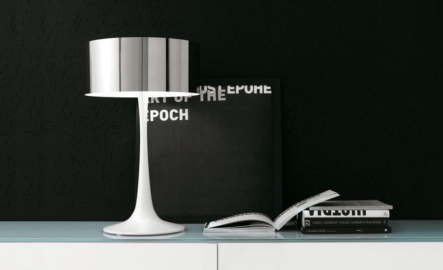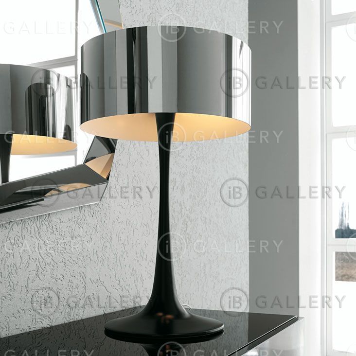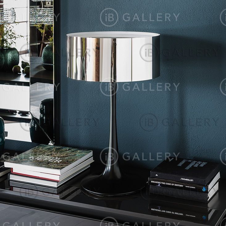 Настольная лампа с абажуром из полированной нержавеющей стали.