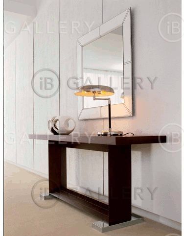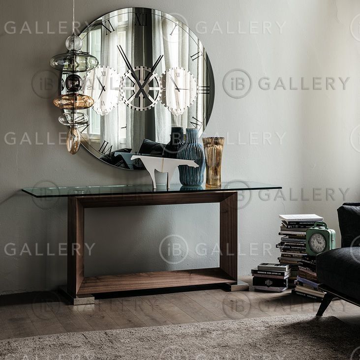 Консоль с основанием из дерева, нержавеющей стали или мрамора и ножками из нержавеющей стали.