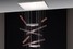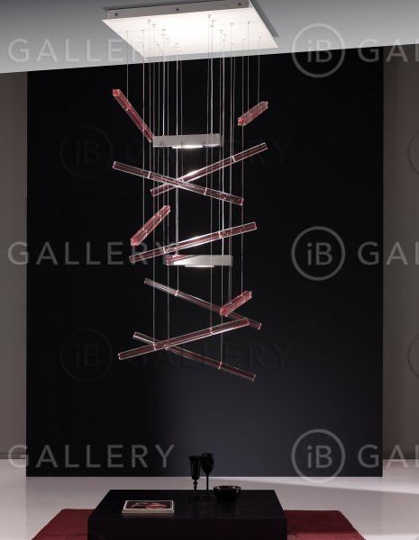 Светильник состоящий из подвешенных белых металлических ламп и стальной рамы из муранского стекла красного или белого цвета.