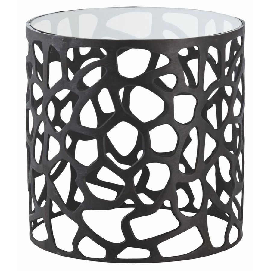 Стол имеет круглую столешницу, которая сделана из стекла. Каркас сделан из железа и имеет разнообразный отверстия. Идеально подойдет для жилого помещения.
