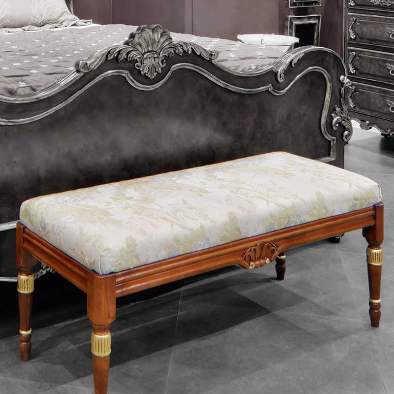 Нижний край каркаса банкетки декорирован по центру выпуклым резным украшением в форме стилизованной раковины.