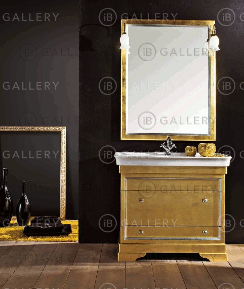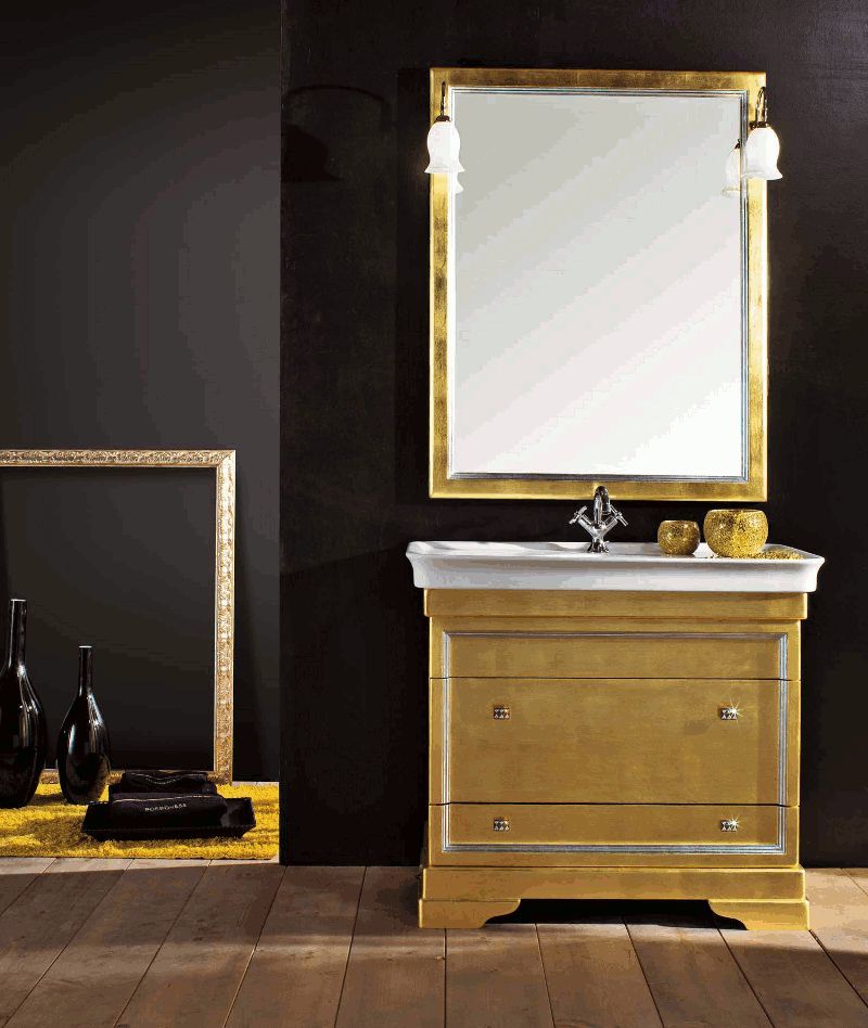Шкаф для ванной комнаты, отделанный под золото с серебряными контурами.