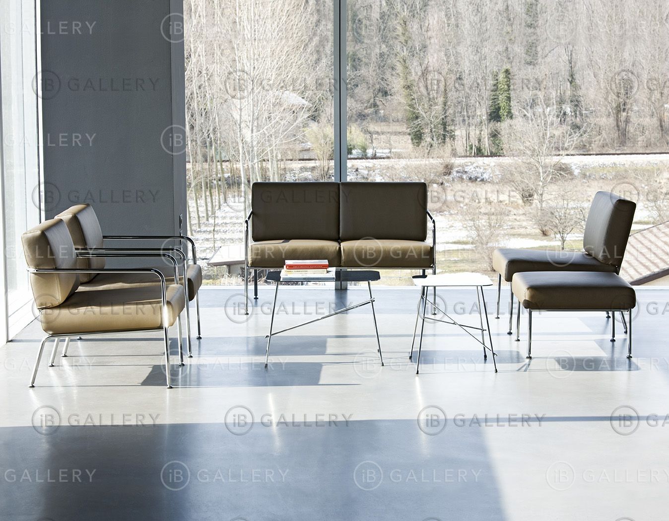 Мягкое широкое кресло c подлокотниками, наполненное полиуретаном с эффектом памяти, на четырех хромированных ножках.