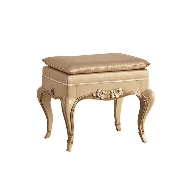Элегантный пуф на деревянной раме, которая украшена резьбой.