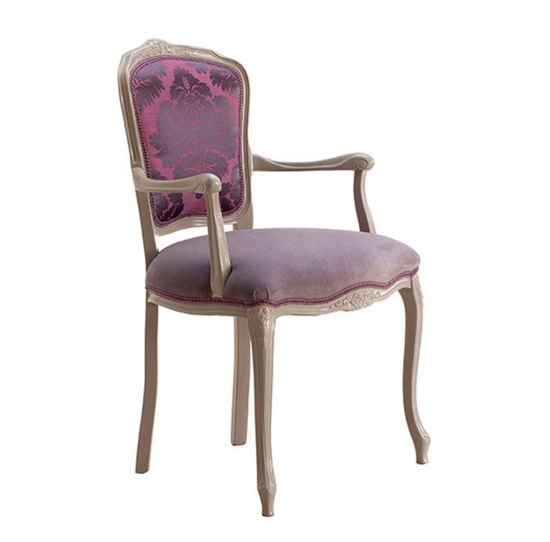 Мягкий стул, выполненный в классическом стиле. Оснвоание и подлокотники сделаны из дерева.