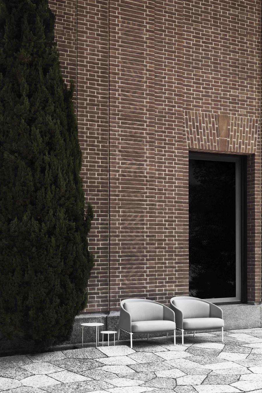 Подушки сиденья и спинки, набитые пенополиуретаном с открытой ячеистой структурой DRYFEEL S, покрыты волокном для наружного использования и водонепроницаемой тканью с подогревом. Обивка только из наружной ткани. Обивка подушек полностью снимается с помощью застежек-молний, а обивка каркаса-с помощью развязывания кевларового плетения, доступного в черном или сером цвете.