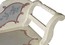 Скамья со средней спинкой и фиксированным линейным верхом, с изогнутыми и выступающими сторонами с повернутыми подлокотниками. Передняя часть сверху и по бокам с простой панелью ручной формы. Цветная отделка гипсом и окрашенные украшения.