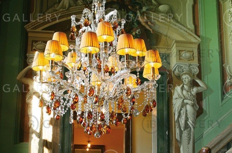 Подвесная люстра с 16 источниками света с плафонами в виде подсвечников на позолоченном каркасе, украшенном подвесками. Люстра имеет два уровня.