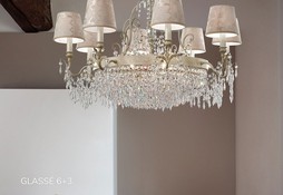 Люстра с плафоном на основе позолоченного каркаса, украшенного нитями подвесок.