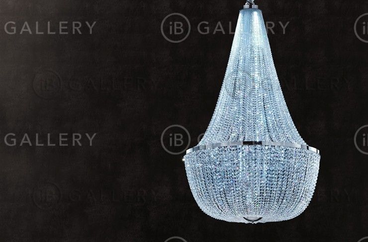 Люстра подвесная с плафоном на основе хромированного каркаса, украшенного прозрачными нитями подвесок.