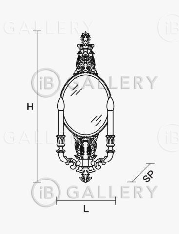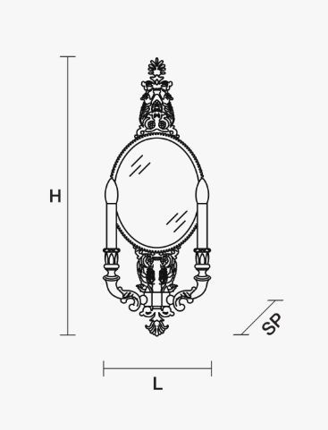 Светильник настенный с двумя абажурами в виде подсвечников на позолоченном основании, украшенном прямоугольным зеркалом.