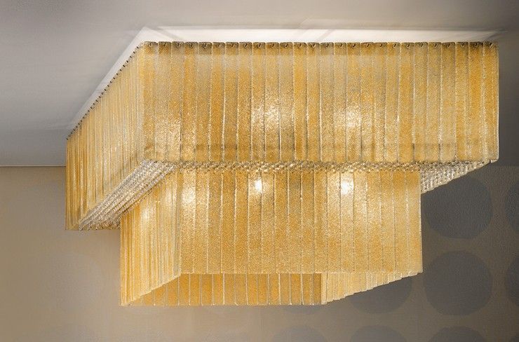 Люстра потолочная двухъярусная прямоугольной формы с 18 источниками света из стеклянных позолоченных пластин.