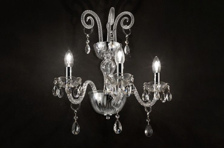 Светильник настенный с 3 плафонами в виде подсвечников, украшенных хрустальными подвесками.