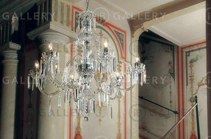 Люстра подвесная 6 рожковая с абажурами в виде подсвечников, украшена хрустальными подвесками.