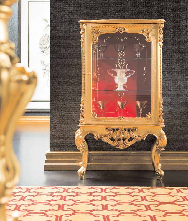 Витрина с 1 створкой, гравированными стеклами, деревянной поверхностью и стеклом.