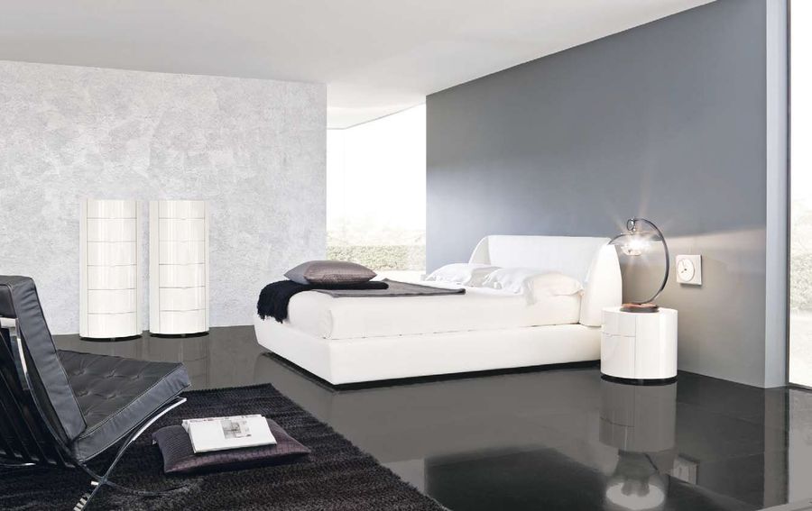 Большая двуспальная кровать в современном стиле с высоким мягким изголовьем.