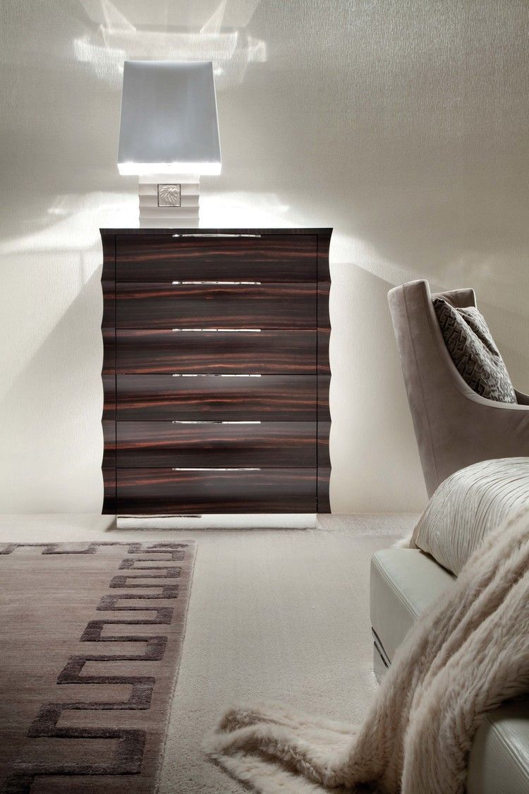 Комод облицован шпоном из макасарского эбена с матовым полиэфирным покрытием и оборудован 6-ю полностью выдвижными ящиками, дно 2-х верхних ящиков обито бархатом.