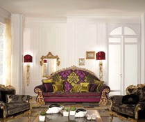 Светлый каркас из древесины благородных пород обильно украшен декоративной резьбой, выполненной искусными мастерами фабрики Asnaghi Interiors. Обивка из натуральной ткани. Мягкие подлокотники в тон обивке. Спинка дивана зрительно разделена на 3 секции, каждая украшена декоративной стяжкой капитоне.