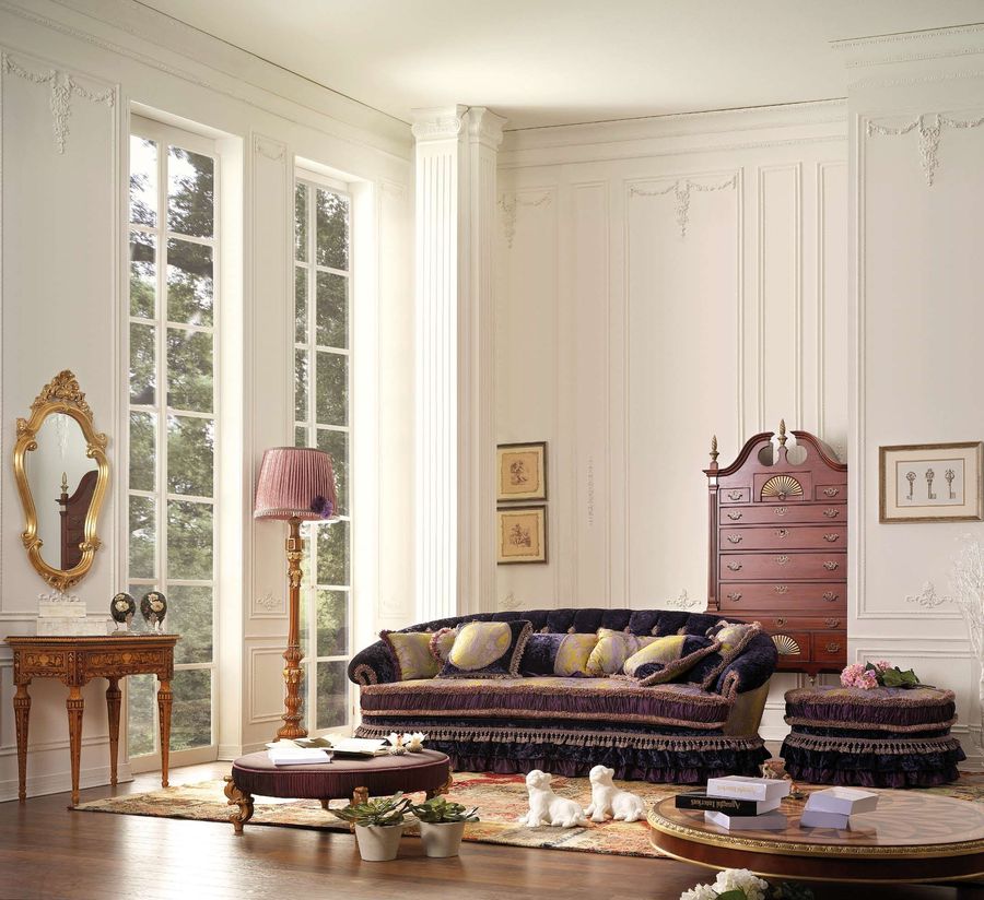 Большой мягкий диван. Каркас выполнен из натурального дерева. Текстильная обивка темно-синего и фиолетового цветов. Сиденья обиты текстилем с оригинальным светлым рисунком. Декоративная бахрома на основании сидения. Спинка дивана украшена декоративной стяжкой.