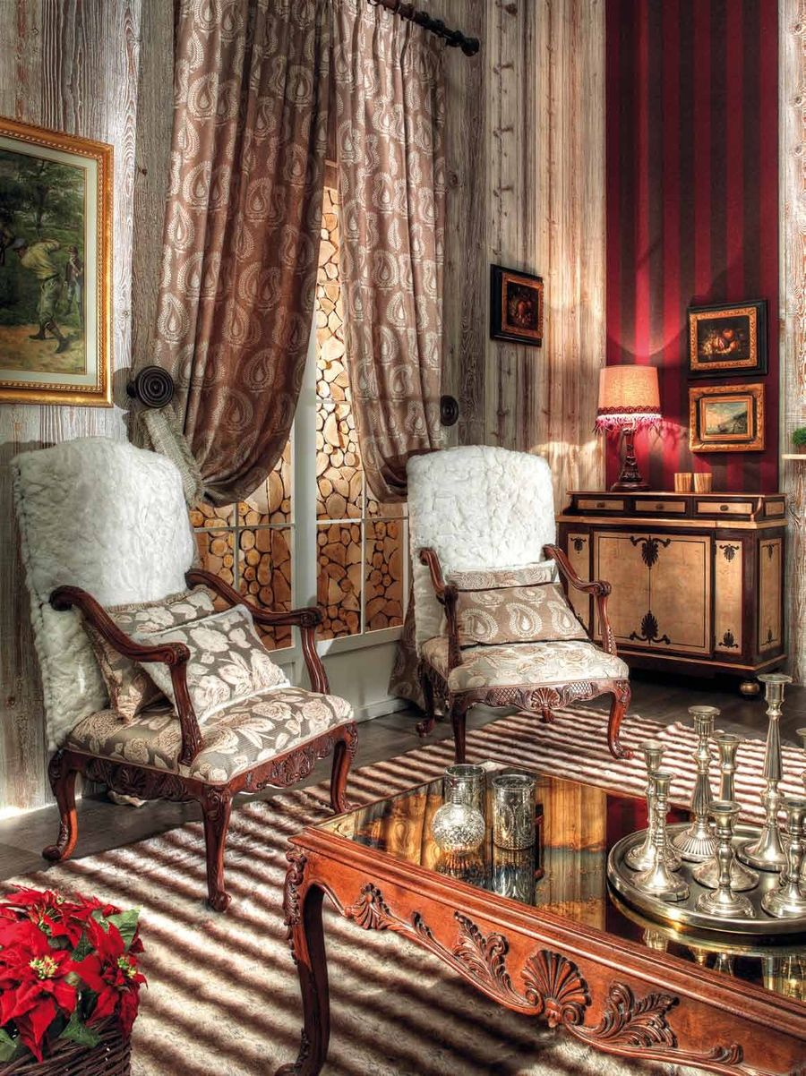 Кресло на каркасе из натурального дерева. Текстильная обивка из натуральной ткани. Сиденье с растительным орнаментом. Спинка белая меховая. Подлокотники изогнутые, украшены декоративной резьбой, как и основание сиденья и ножки.