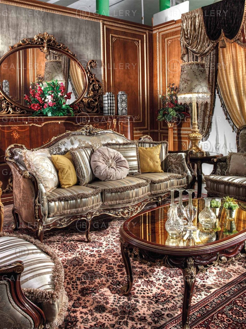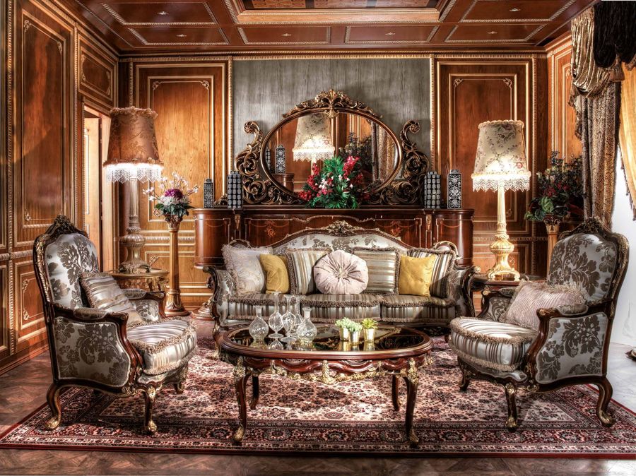 Диван на темном каркасе из натурального дерева. Украшен декоративной резьбой. Особенно крупная и изящная резьба на спинке и основании сиденья модели. Декоративные элементы покрыты позолотой.