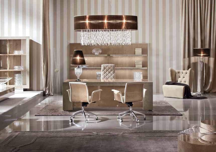 Мебель кабинета выполнена из шпона клена цвета "шампань", высококачественных тканевых и кожаных материалов, декорирована хромированной сталью.