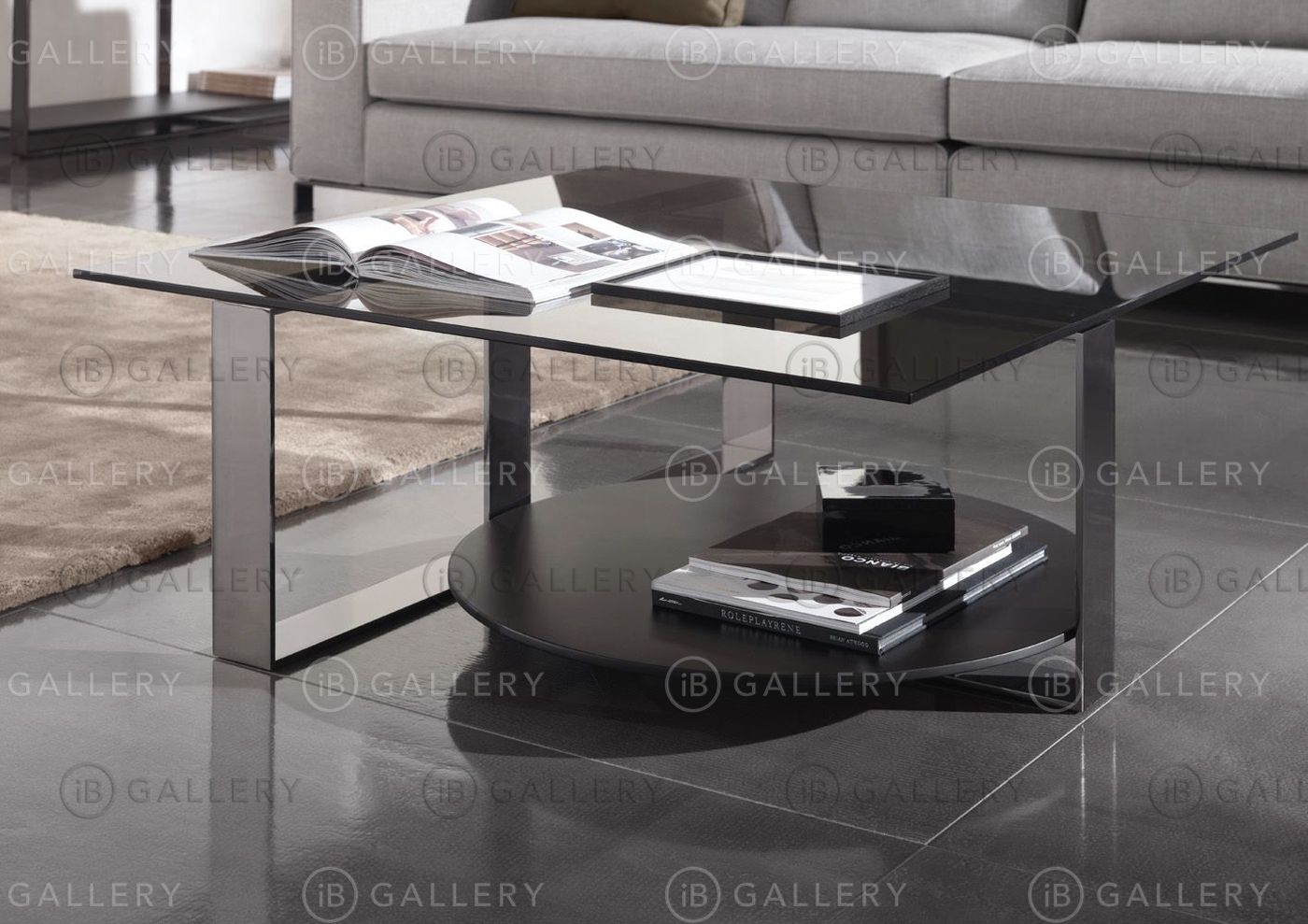 Верхняя столешница может быть круглой или квадратной формы, выполнена из тонированного стекла. Основание металлическое, цвета черного никеля.