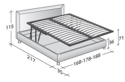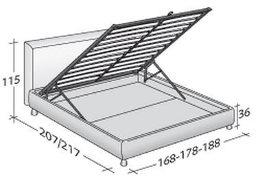 Модель доступна в нескольких вариантах ширины и в разных конфигурациях. На выбор: вариация с местом для хранения в основании (откидное или поднимающееся основание), без ящиков - с фиксированным основанием "комфорт" или ортопедическим.